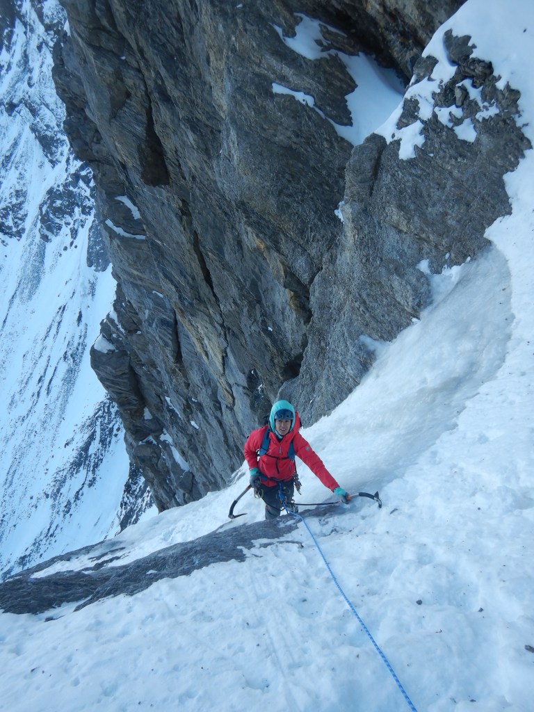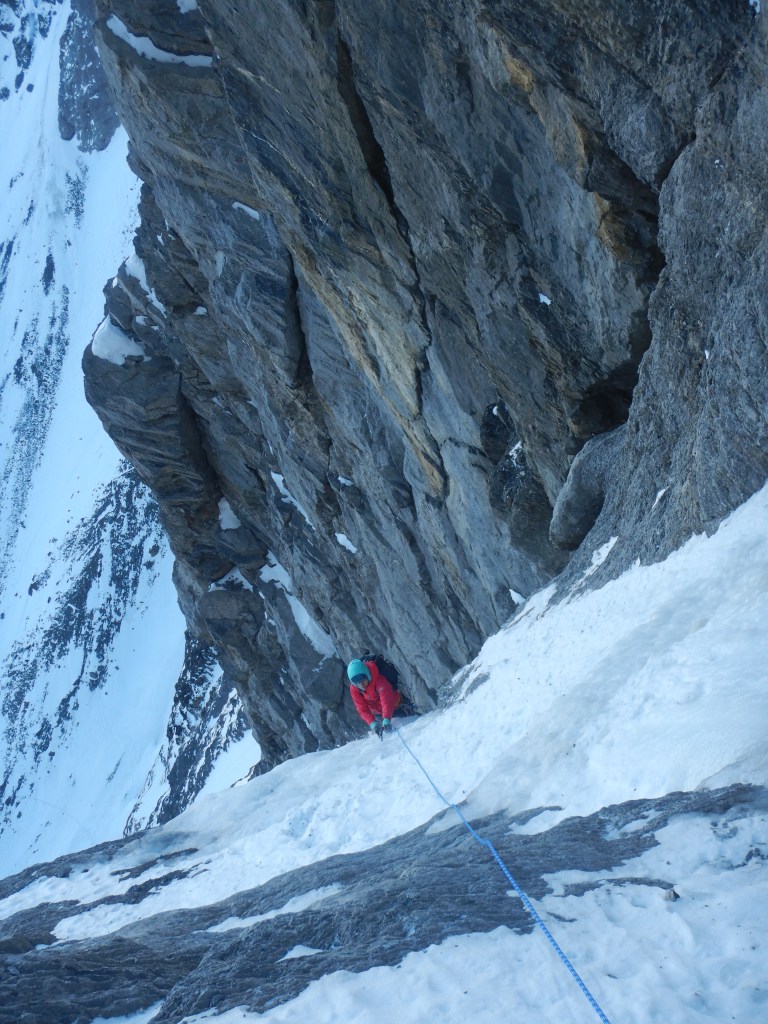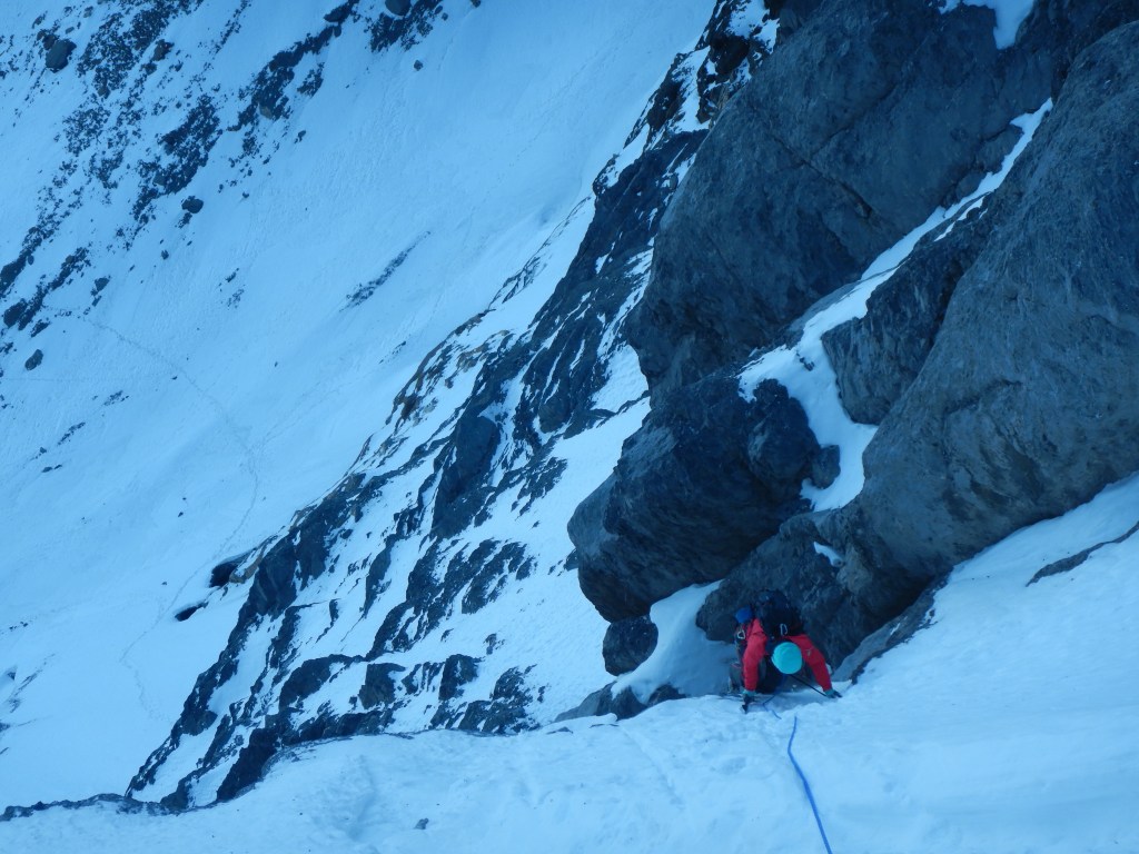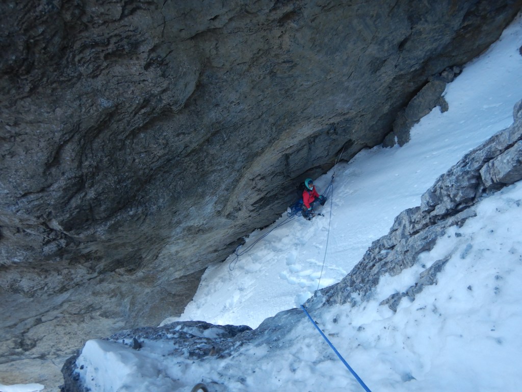 Länge 4, M3, ist dann einfach über ein Schneeband und eine kurze Felsstufe, welche dann aber nicht ganz solide und banal zu klettern ist wie erwartet. Nachgesichert habe ich im Loch hinten unten direkt über den Körper.