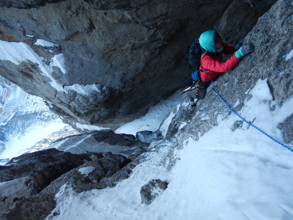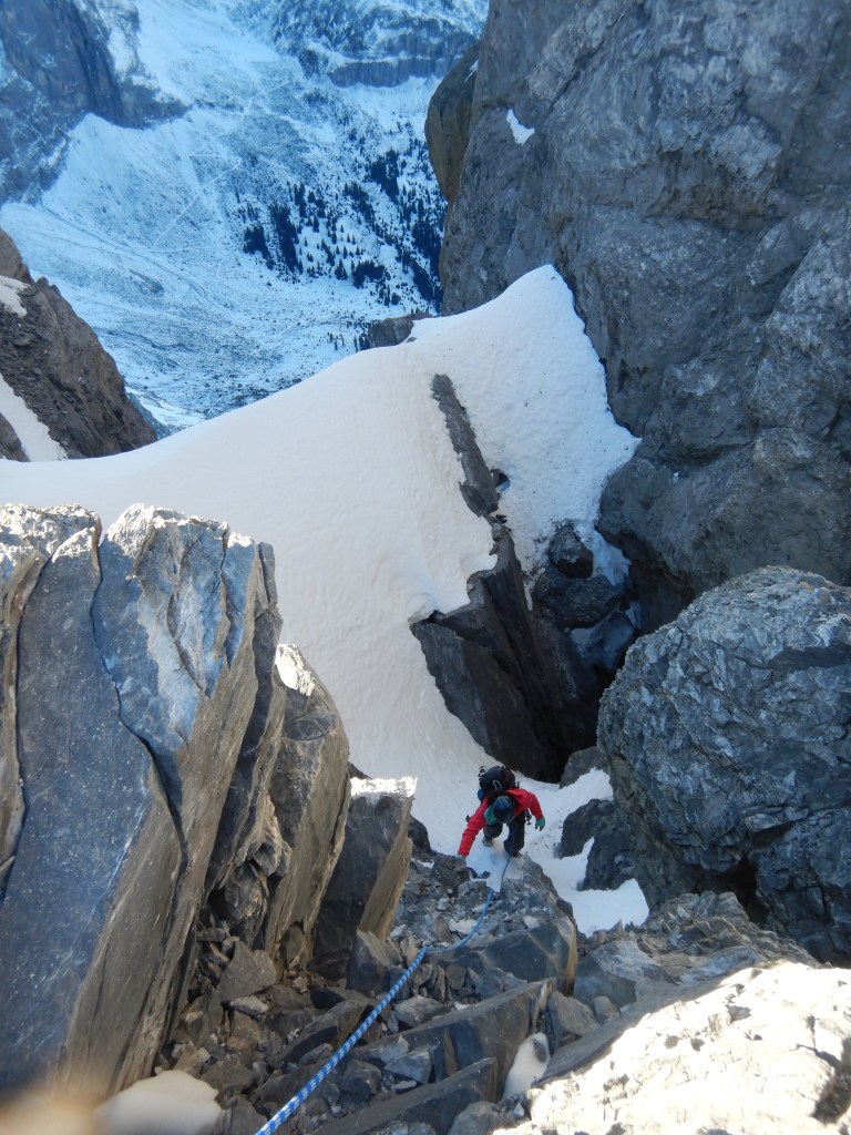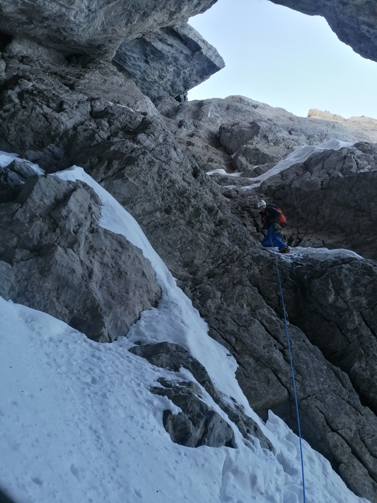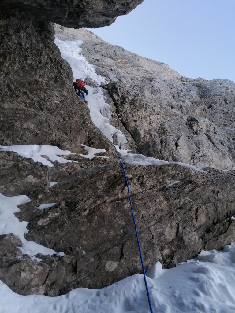 Länge 4, M3, ist dann einfach über ein Schneeband und eine kurze Felsstufe, welche dann aber nicht ganz solide und banal zu klettern ist wie erwartet. Nachgesichert habe ich im Loch hinten unten direkt über den Körper.