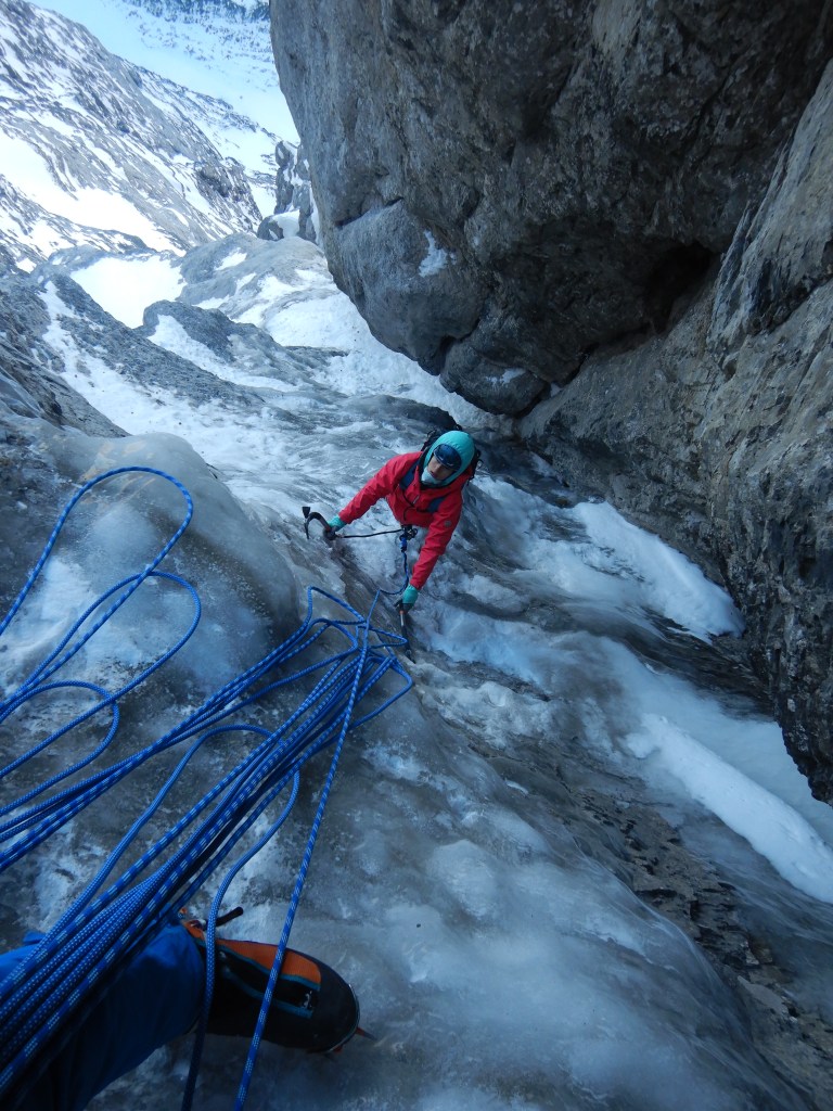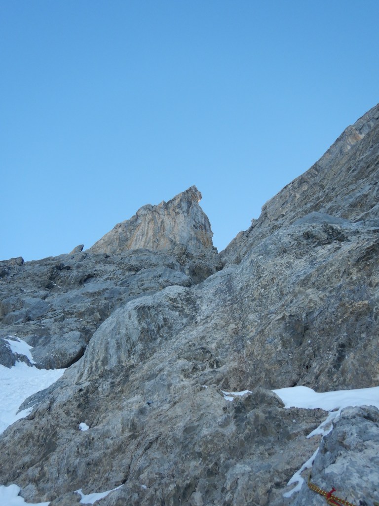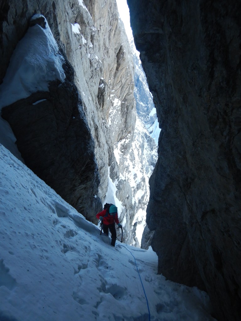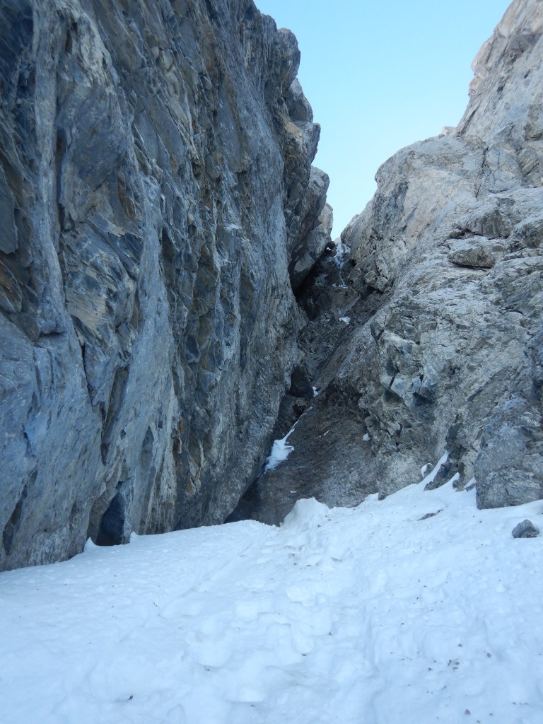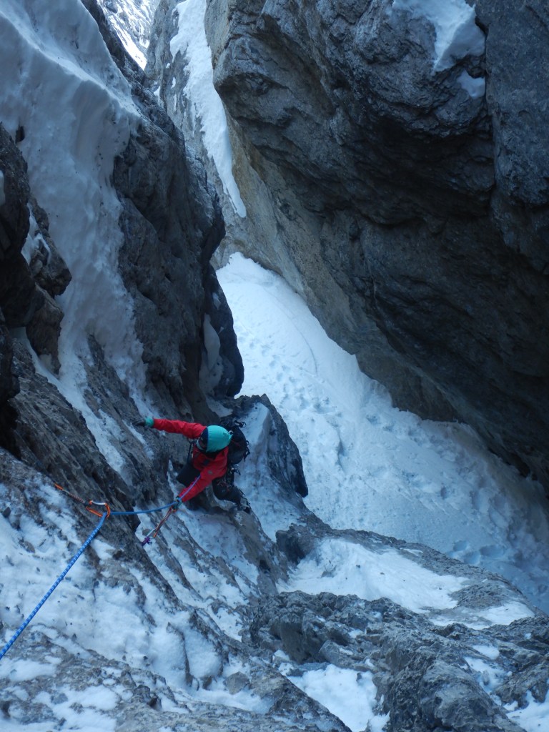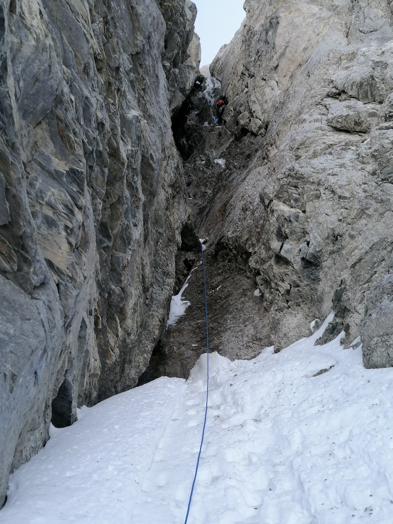 Zuerst geht’s im Schnee zum Glück bereits gespurt aufwärts zur Rinne und die erste Felsstufe steht kurz darauf im Weg. Sie ist einfach aber noch halb schläfrig dann doch anspruchsvoller als erwartet. Es kann 5m oberhalb an der linken Seite des Couloirs im Fels an einem 0.3 Friend nachgesichert werden.