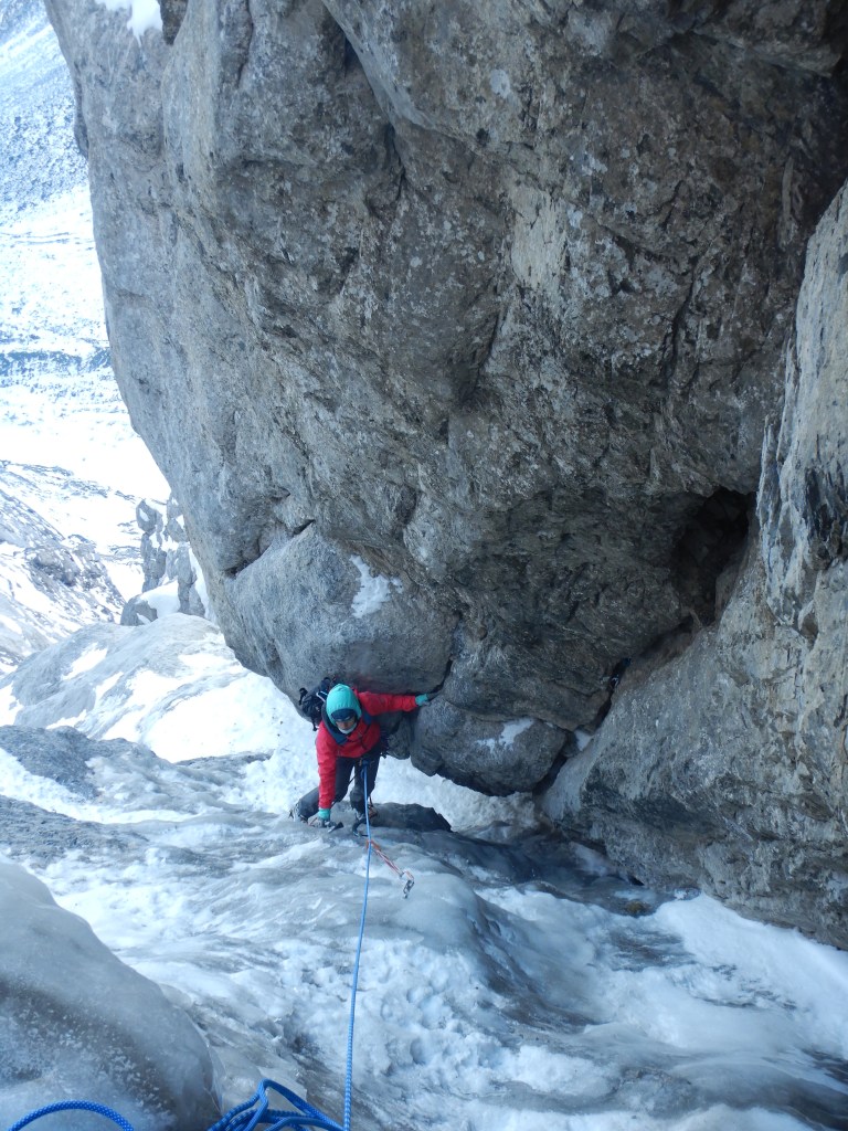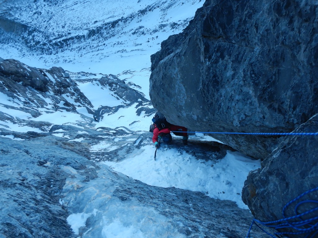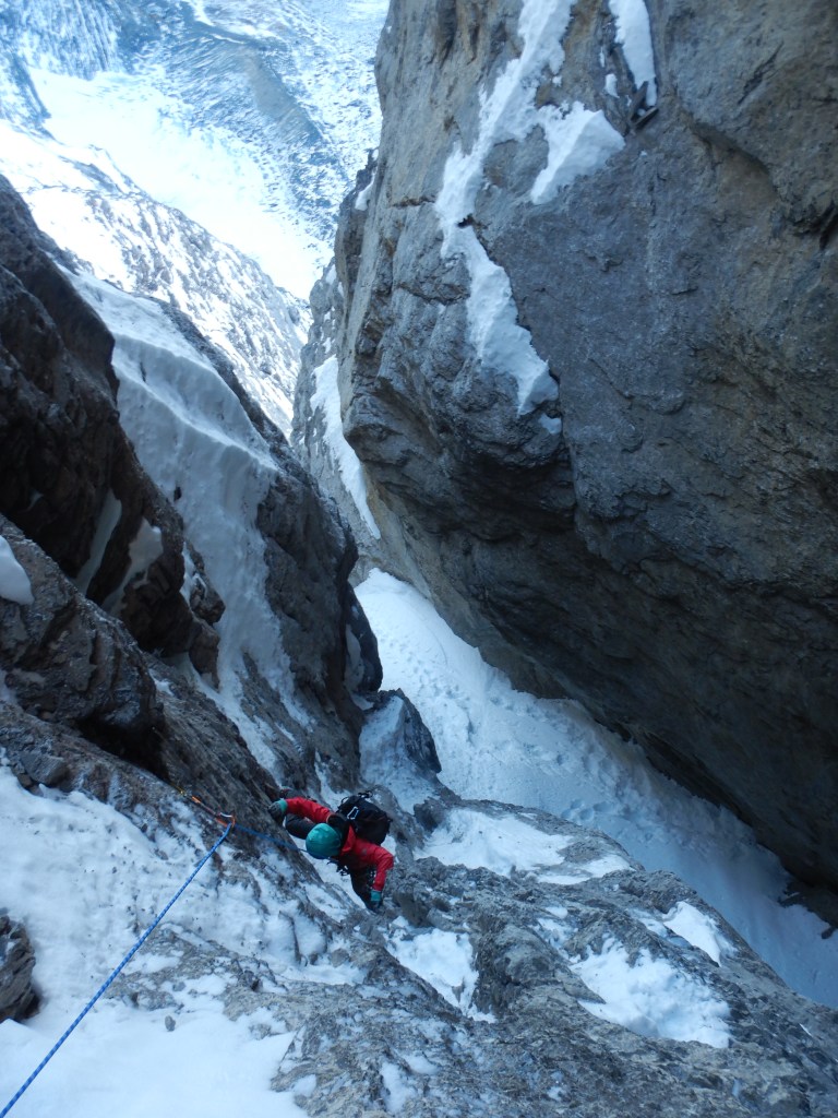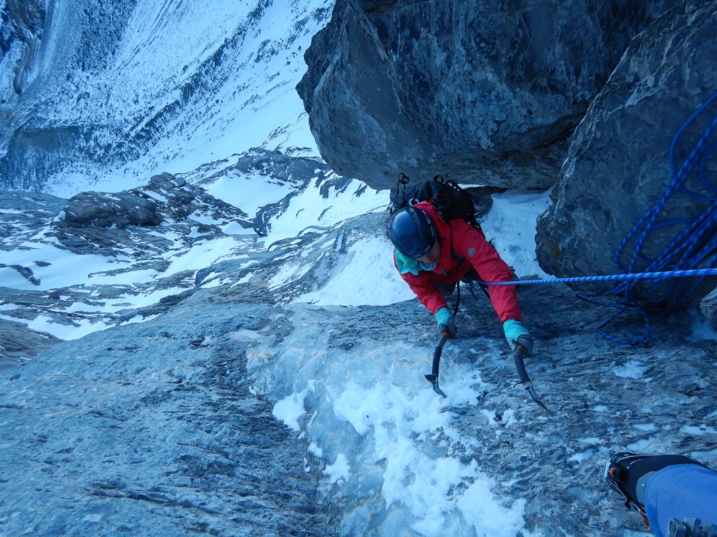 Die Schlüssellänge (SL6, M6) startet im Eis, einfach und kurz hoch in ein Schneefeld. Am Anfang des Felses bringt man dann wieder einen kleineren Friend unter, welcher eher weniger vertrauenswürdig ist. Die Kletterei aber super geschichtet und im Kamin stemmend geht’s hoch bis zur bereits vom unteren Stand sichtbaren Rissschuppe in der rechten Seitenwand, hinter welcher man einen soliden Friend unterbringt (0.75 wenn ich mich recht erinnere). Einige Meter höher kommt dann der Zwischenstand, welchen ich dank den Empfehlungen von Marcel Dettling auslasse aber mit einer langen Schlinge klippe. Es geht nach rechts raus und in der ausgewaschenen Rinne wieder zurück ins Risssystem (Crux der Länge) und von da bedeutend einfacher hoch zum Stand.