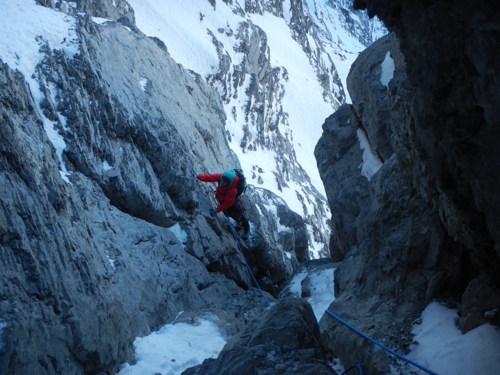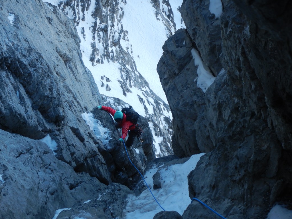 Weiter das Couloir hoch und an den Felsen nach rechts zur ersten Seillänge (M6, meiner Meinung nach) welche ein Kamin ist.